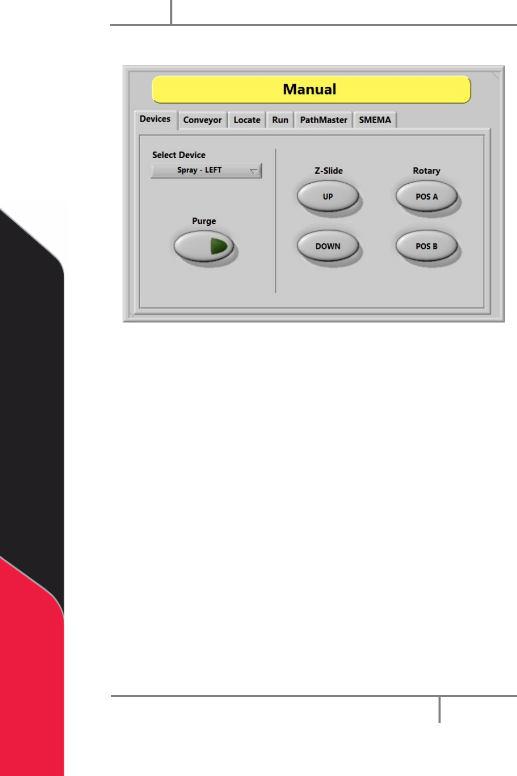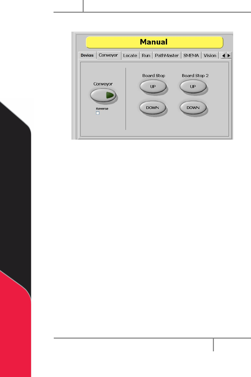 Portal PVA Revisio n H ( 2018 ) 23 of 93 6.2 Convey or Co ntro l Fig ure 10 : Conveyo r Control, Ma nual Mode The conv eyor and th e board s tops are contr olled und er the “ Conveyor ” tab so the operator can adj ust th…
