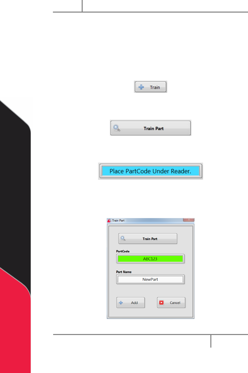 3. The Train window will prompt you to put the partcode under the reader.