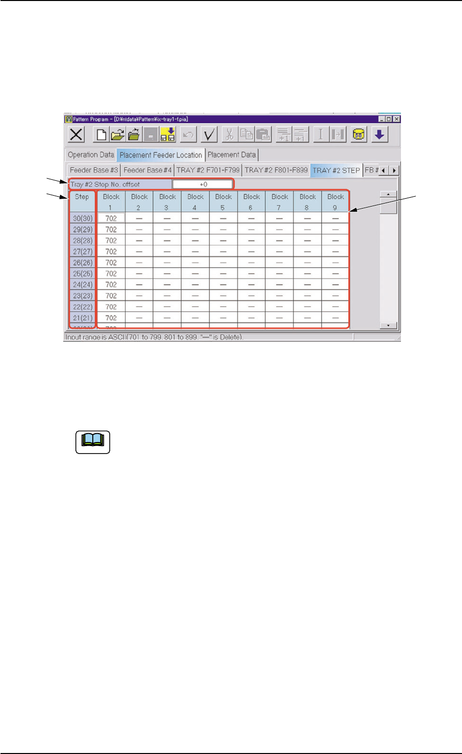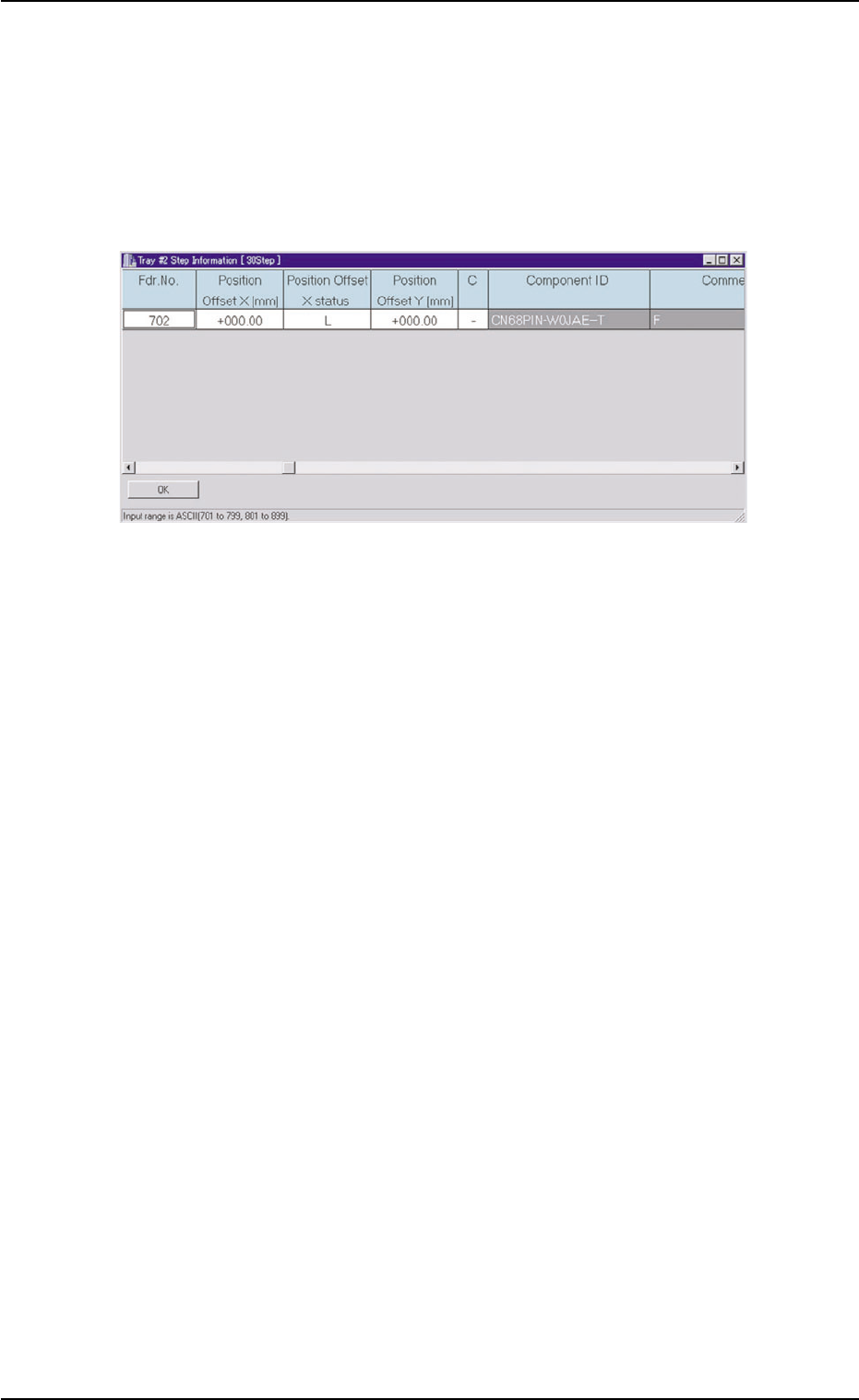 1.3.2 "TRA Y #2 STEP" T ab • • • • • Sheet Layout When the "TRA Y #2 STEP" tab is pressed in the "Placement Feeder Location" tab sheet, the following tab sheet appears. Fig. C12 "T ray …