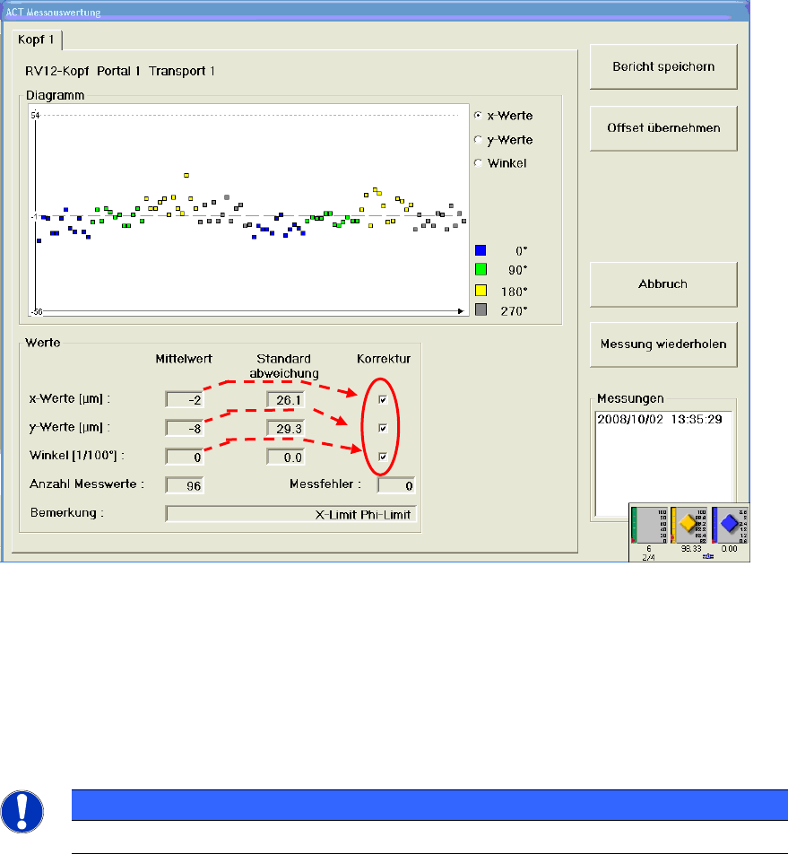 The values that are marked under Correction are corrected in the machine data (see section