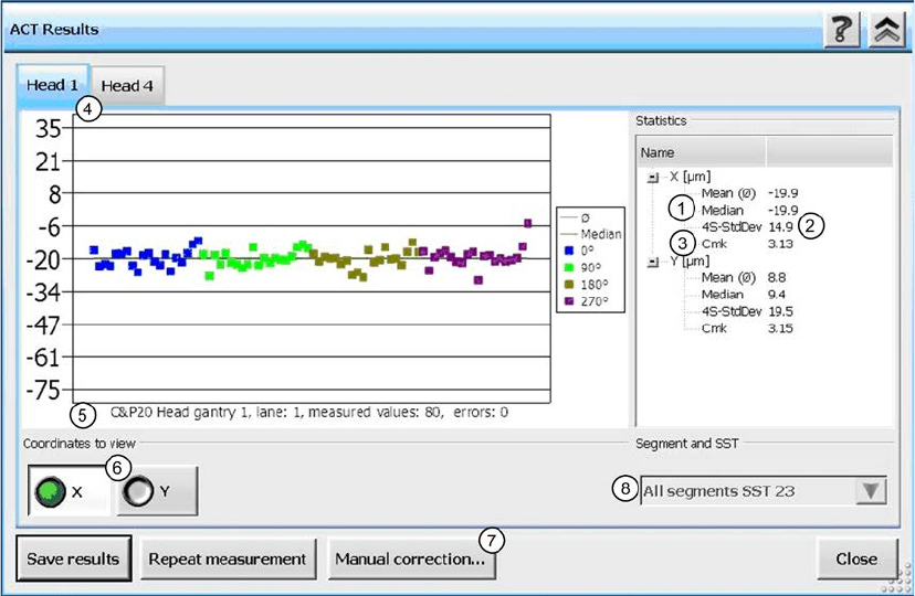 ACT - Accurac y Check T ool / User Manual 07/2014 Edit ion 63 4.2.5.1 Measurement Ev aluation and M easuremen t Data The m easur e ment res ults are then displa yed as f ollows : Figure 4- 44 : ACT measurement results Ke…