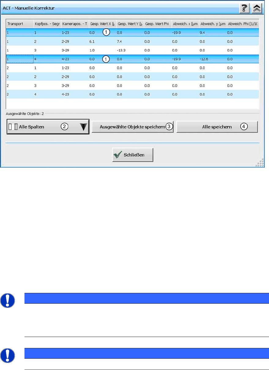 ACT - Accurac y Check T ool / Bed ienungs anleitung Ausgabe 07/2014 65 4.2.5.2 Ko rrigiere n der gemessenen Offsets ► Aktivier en Sie die Schaltf läche M anuelle Korr ektur ( siehe Abbildung 4- 44 ) . Folgend er Dialog w…