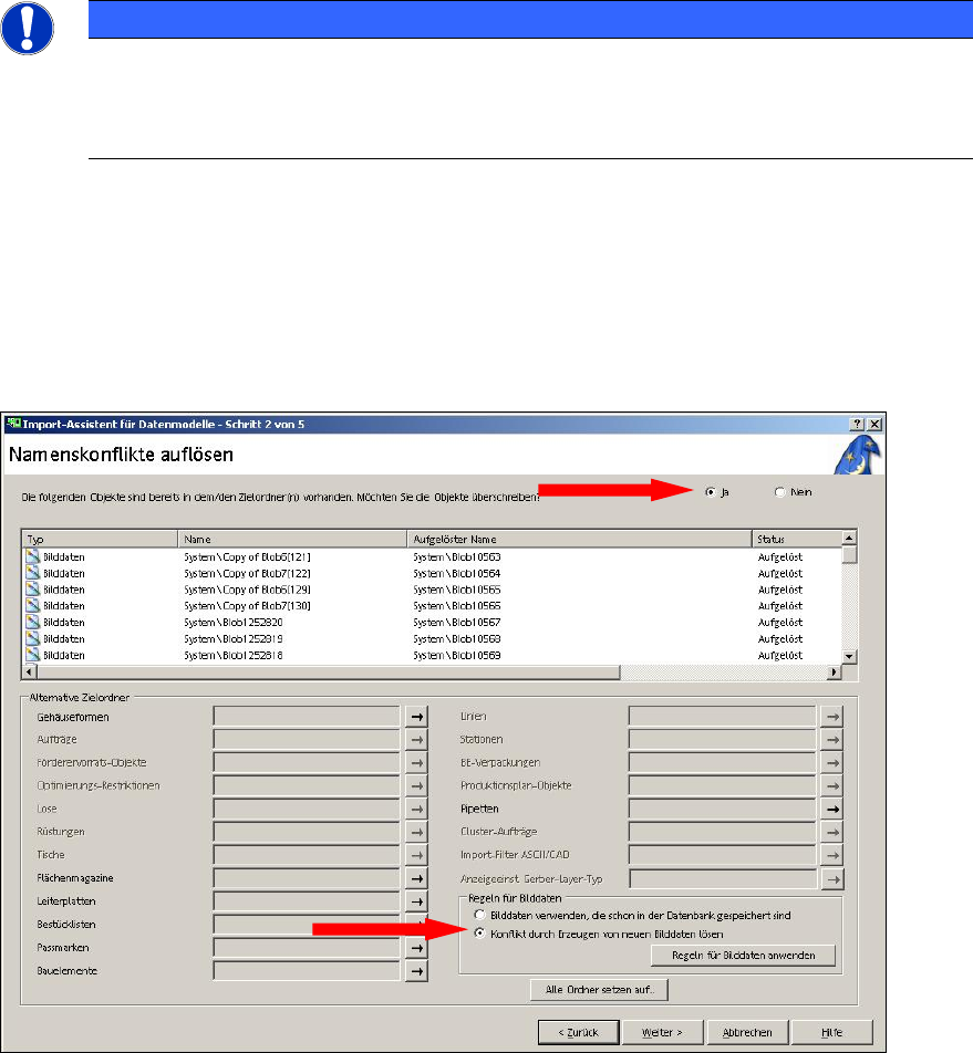 ► To overwrite the objects, set the option Die folgenden Objekte sind bereits in dem/den