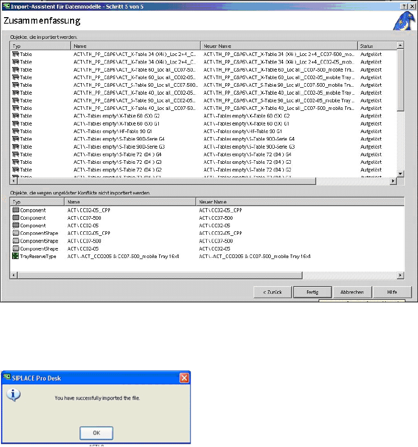 Figure 3-25: Finished import of XML files for tables in SIPLACE Pro