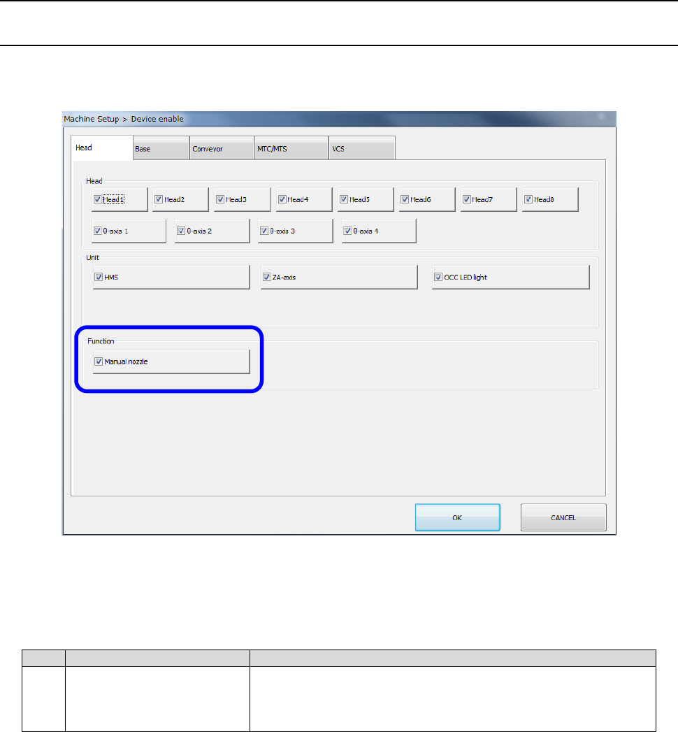 Part 2 D etaile d Descript ion of E ach Functi on Chapter 12 Handling th e Optional Device s 12 - 116 12.16.4.2 Assigning a nozzle When you se lect [Devic e enable] – [Head], and then en able the “Manual nozz le” functio…
