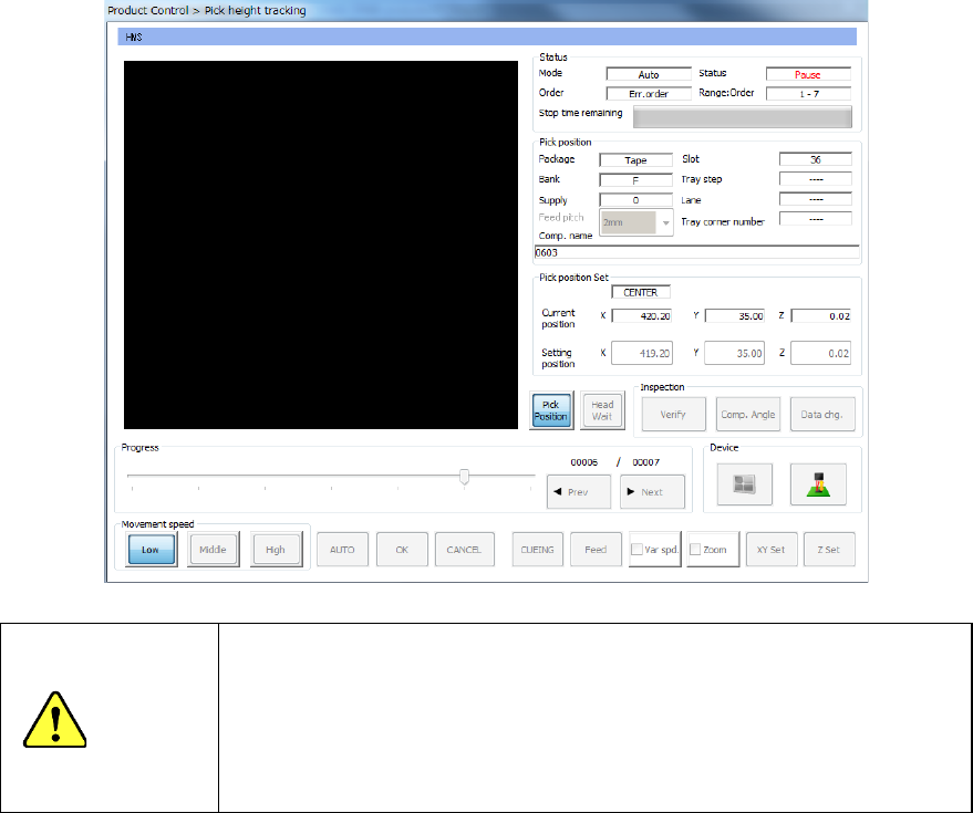 Part 1 B asic O peration Chapter 2 Pr oduction 2- 30 ② P ress the < Pick T race> butt on. The follow ing “Pick pos i tion tr acking” scree n appears. CAUTION Before the sy stem ope ns the “Pick pos ition track ing”…