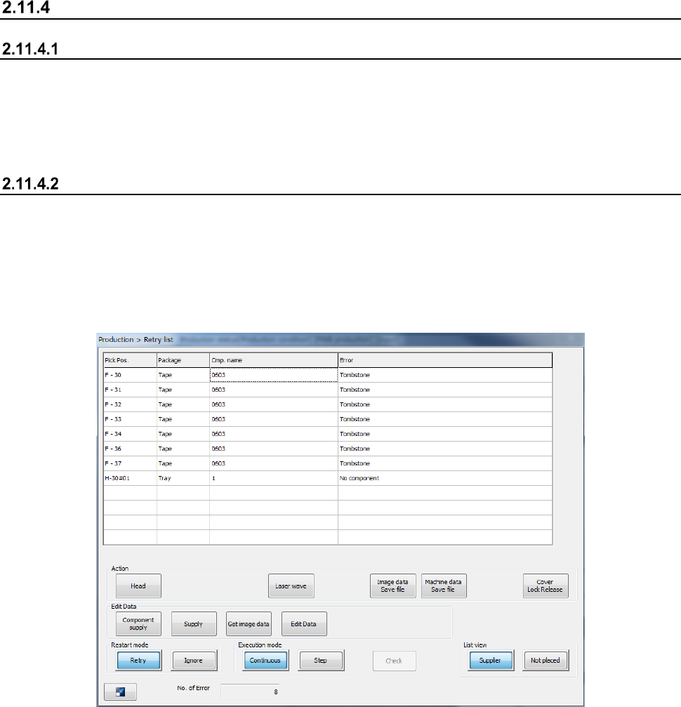 Part 1 B asic O peration Chapter 2 Pr oduction 2- 77 1) List (Supplier) The system di splays errors in ascend ing order of the compo nent supp l y unit positi ons. Menu item Description Pick P os. Displays a component su…