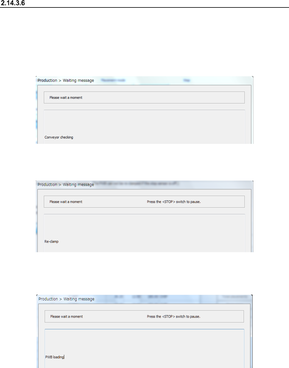 Part 1 B asic O peration Chapter 2 Pr oduction 2- 140 Message for r e - clamping a board When you pres s the <ST ART> s w itch on t he “Re - cla mp” dialog box t o start PWB product ion, the system perf orms each t…