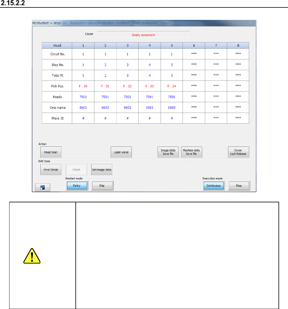 Part 1 B asic O peration Chapter 2 Pr oduction 2- 154 Displayed screen When the syst em pause s because component s run out , it displays t he following dialog box. CAUTION When you pres s the <START> s w itch, the…