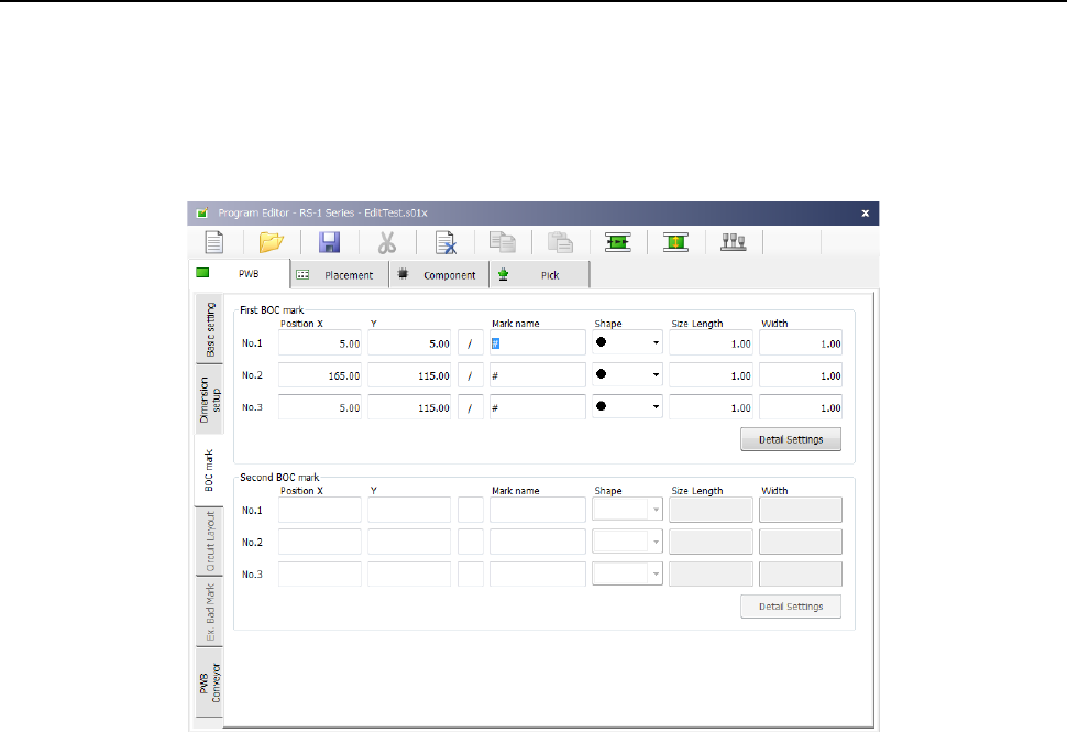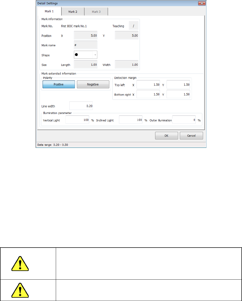 Part 1 B asic O peration Chapter 4 Cr eating a Produc tion Progra m 4- 24 When you pres s the <Detail Settin gs> button, t he screen like one sho wn below appears. Switch the tabs, “ Mark 1 ,” “Mark 2” and “Mark 3.…