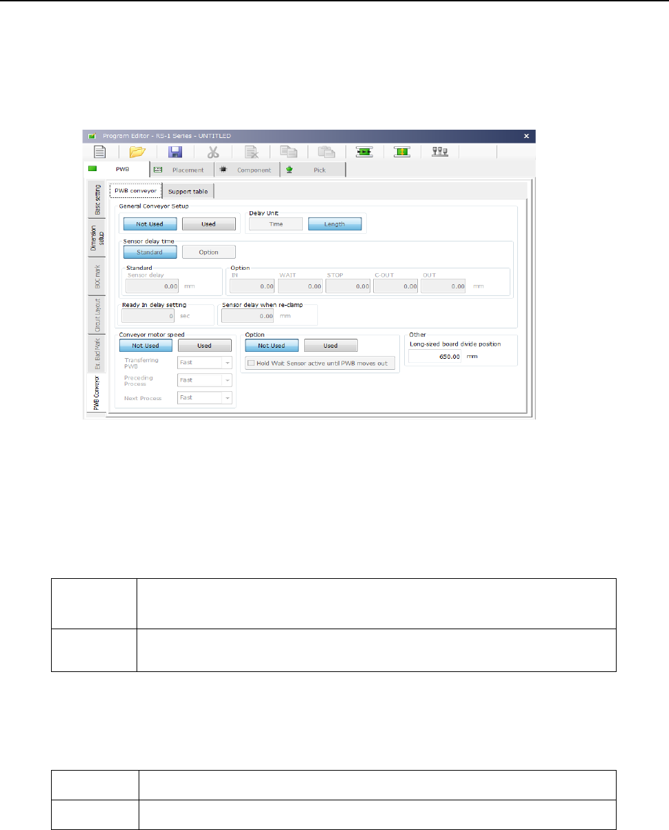 The “PWB Conveyor” screen consists of the “PWB conveyor” tab and the “Support table” tab.