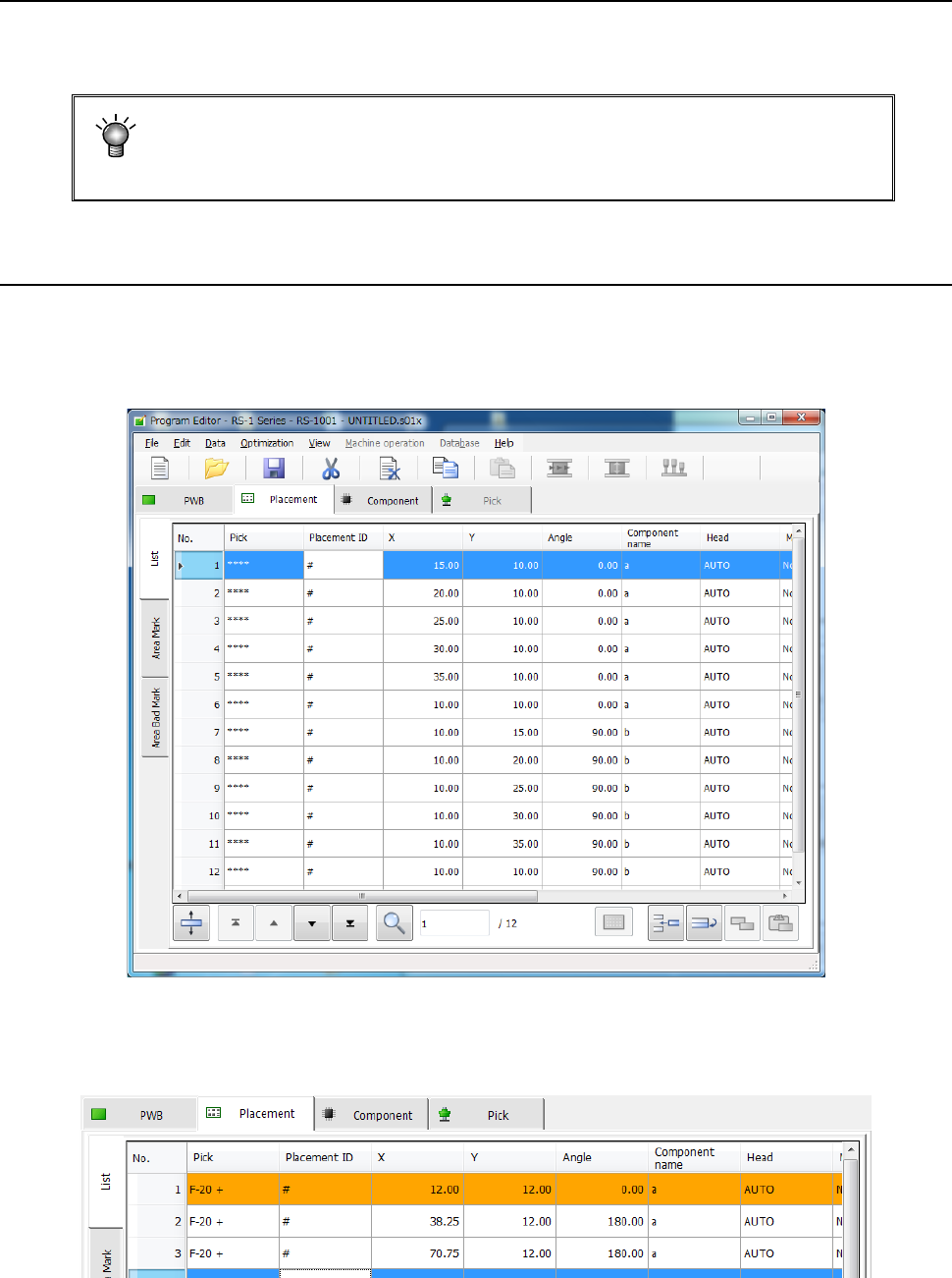 Enter information on the coordinates of positions on which the system is to place components.