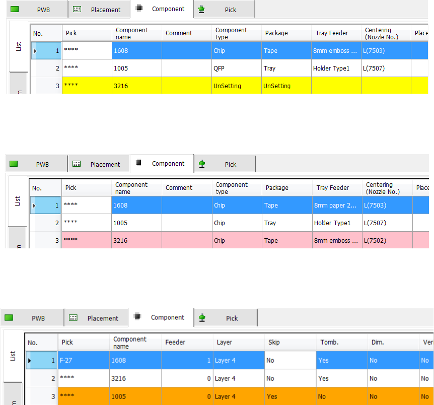 The component name items without data setting are not set are indicated in yellow.