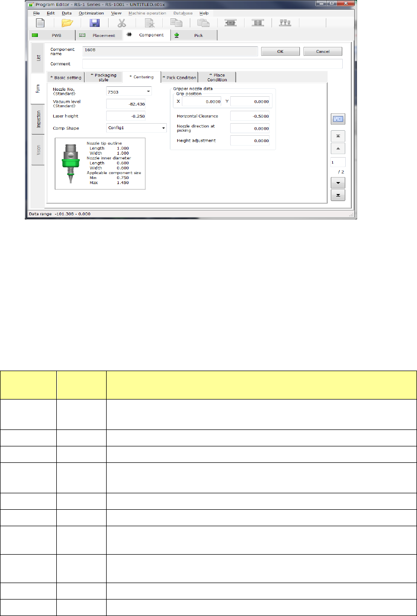 Set the menu items “Nozzle No.,” “Vacuum level,” “Laser height,” “Comp Shape” and