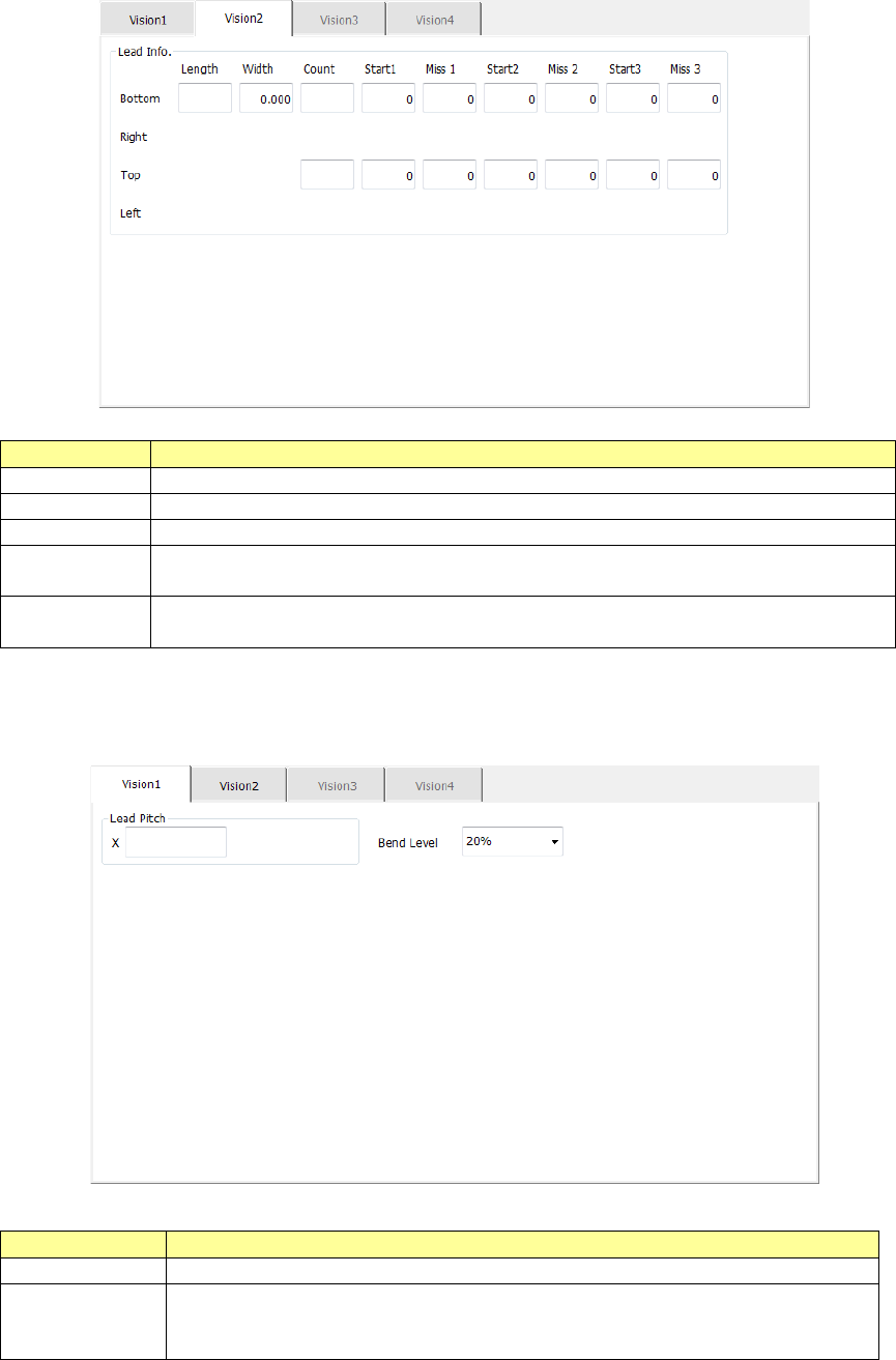 Part 1 B asic O peration Chapter 4 Cr eating a Produc tion Progra m 4- 96 The “Vi sion 2” tab allows you t o set informat ion on leads located on eac h of the left and right sides . Menu item Overvie w Length Enter the l…