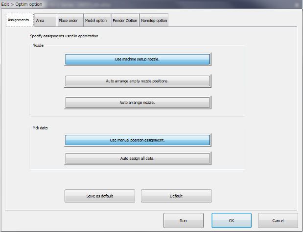 Set "Nozzle layout" and "Feeder layout" intended for dividing (optimizing) the program data.