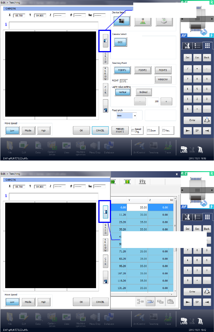 When you start up the teaching function from the menu item such as the “PWB thickness,”