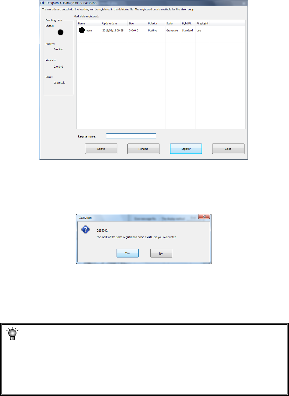 If you do not want to register the taught data into the mark database, press the <Close>