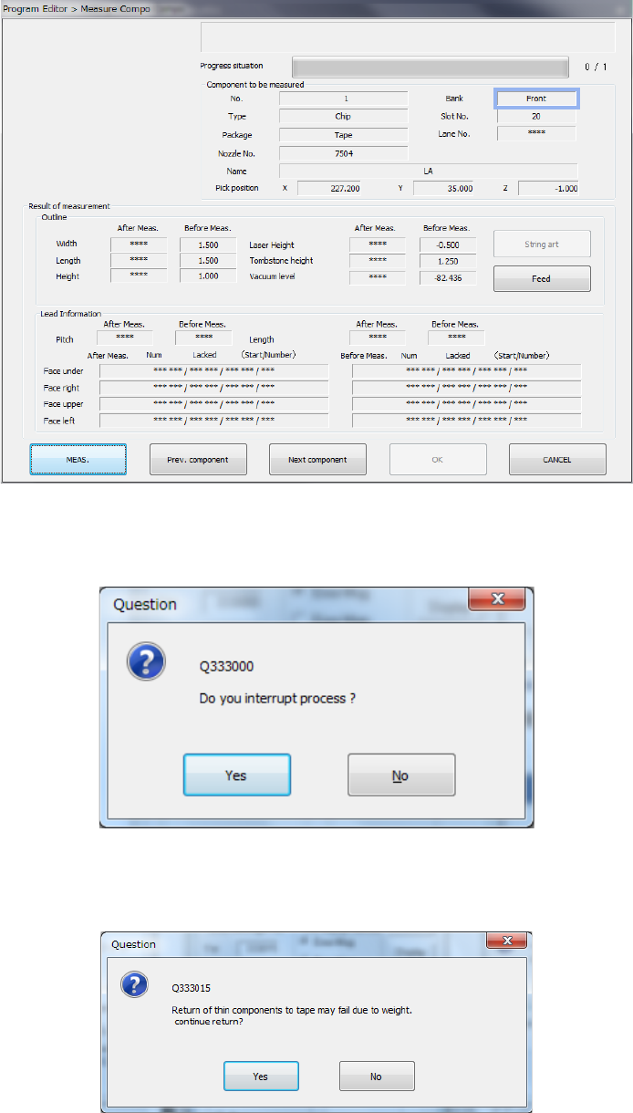 Part 1 B asic O peration Chapter 4 Cr eating a Produc tion Progra m 4- 234 2) Screen displaye d while the current com ponent i s being me asured (“ Measure Com po is being execut ed” scree n) When the sys tem is meas uri…