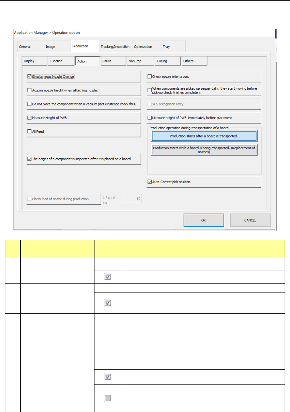When you press the <Action> button, the screen for setting the action options for PWB production