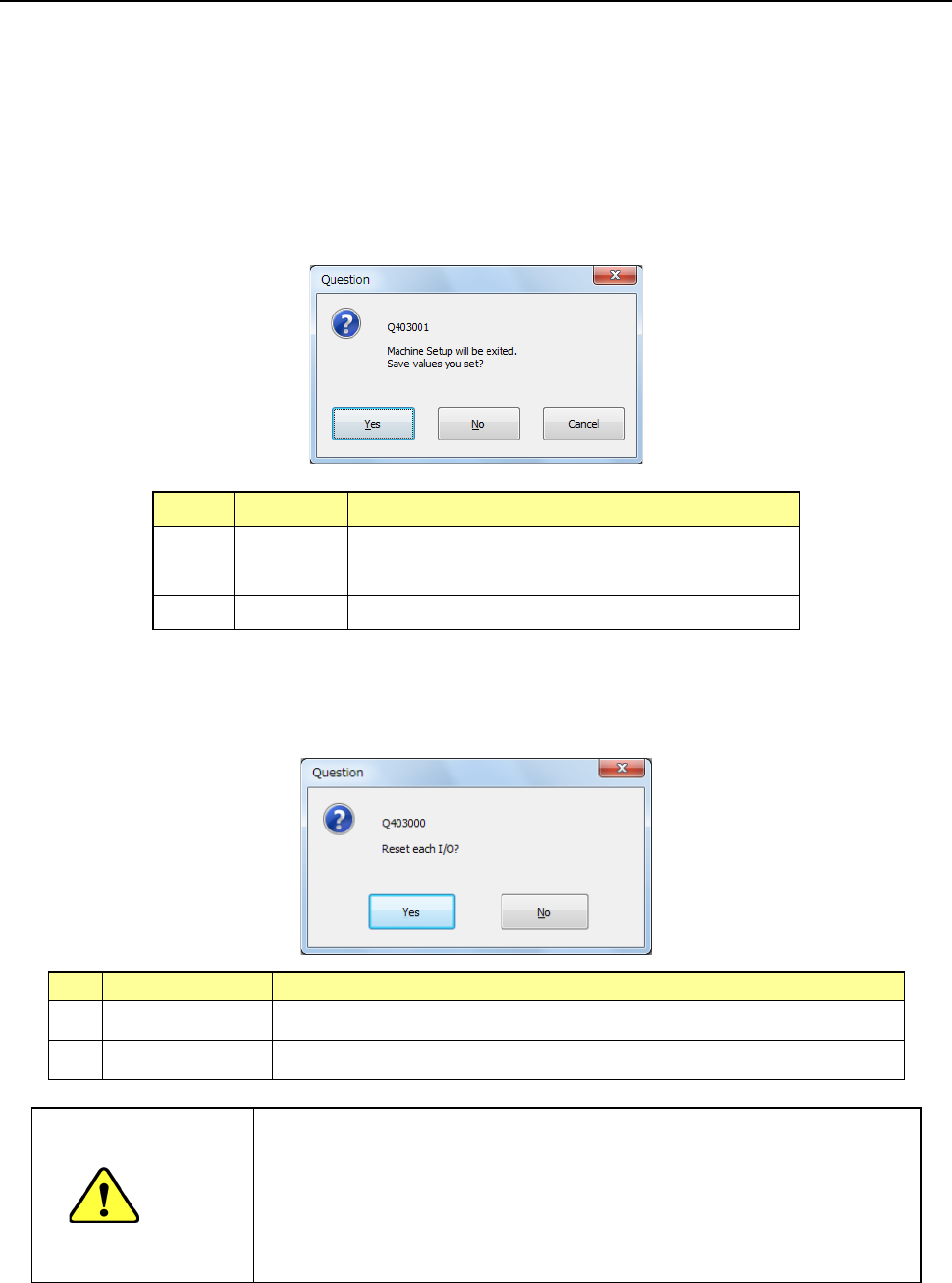 1 Ye s Sets the safety direction of each I/O and quits the Machine Setup utility.