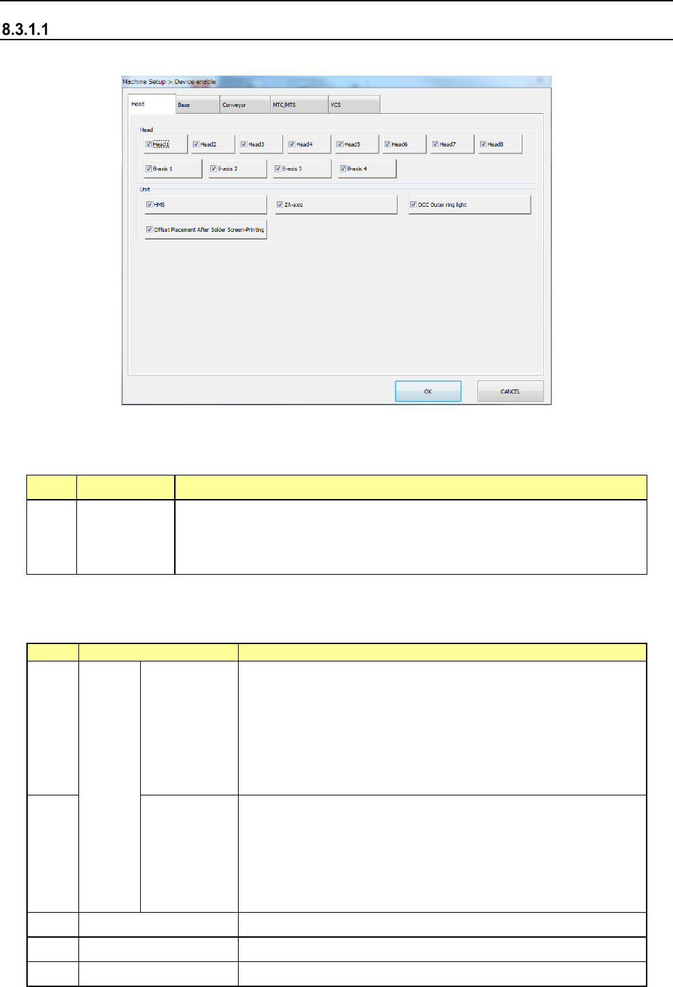 When you click each tab, you can specify each of “Head,” “Base” “Conveyor,” “MTS” and “VCS.”
