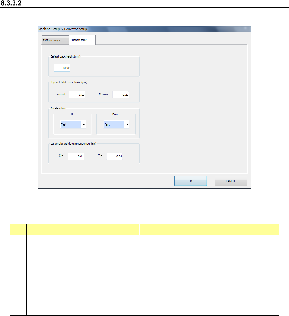 Part 2 D etaile d Descript ion of E ach Functi on Chapter 8 Machine Set up 8- 28 ( 2) How to set 1) Default back hei ght a) W he n the unit i s mm, a value of - 0. 5 to 4 8 can be set . 2) Support table overstroke (av ai…