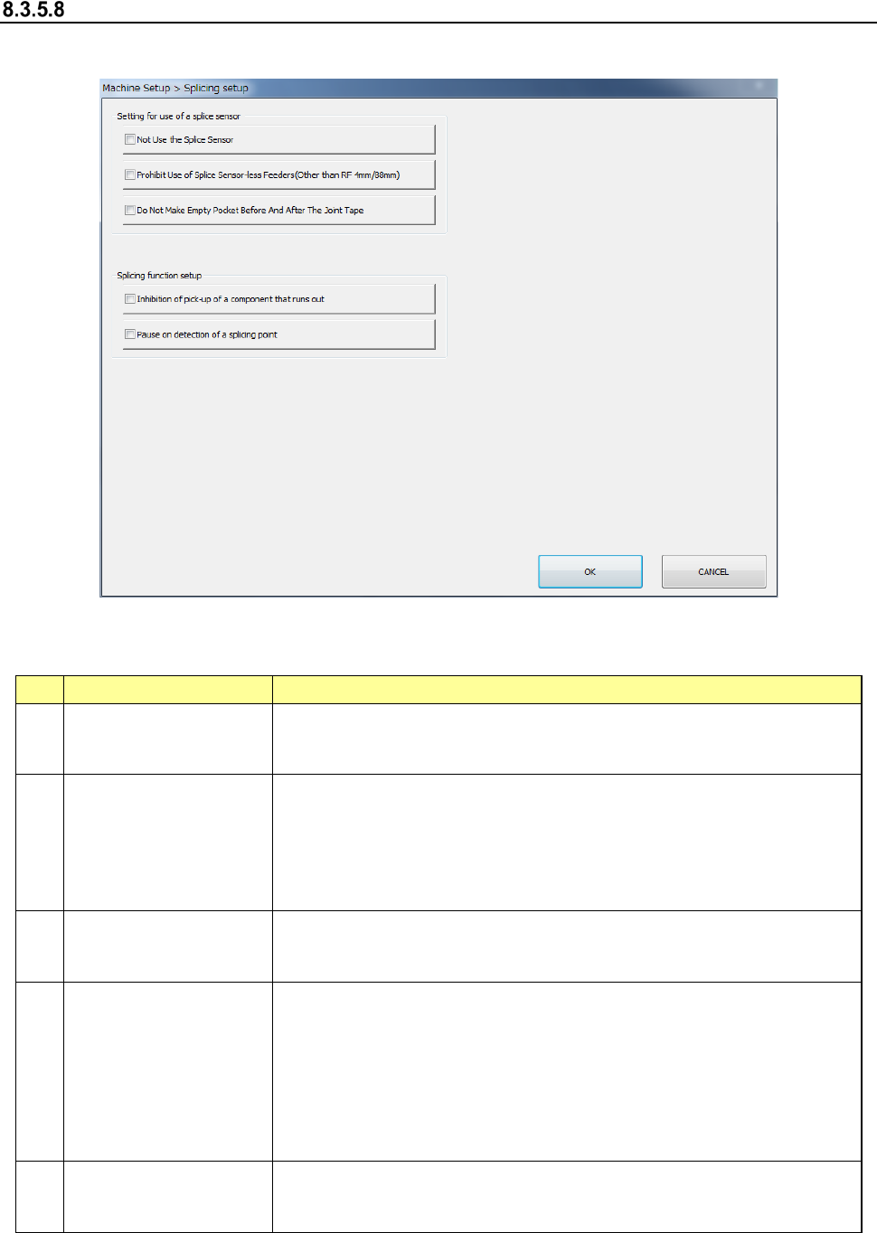 Part 2 Det ailed Desc ript ion of Eac h Fu nctio n Chapter 8 M achine Setup 8- 43 Splici ng setup When you se lect [Spl icing setup] , the screen sh own below will app ear . (1) S etting i tems This tab allows you to ma …