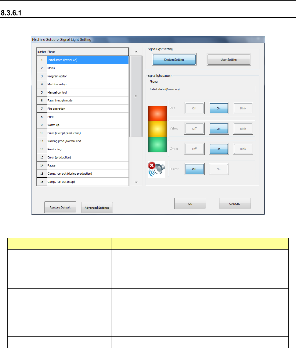 Part 2 D etaile d Descript ion of E ach Functi on Chapter 8 Machine Set up 8- 46 (2) Initial values No. Phase Signal light pattern Remarks Lighting c ondition Red Y ellow Green Buzze r 1 Init ial state (Power on) All col…