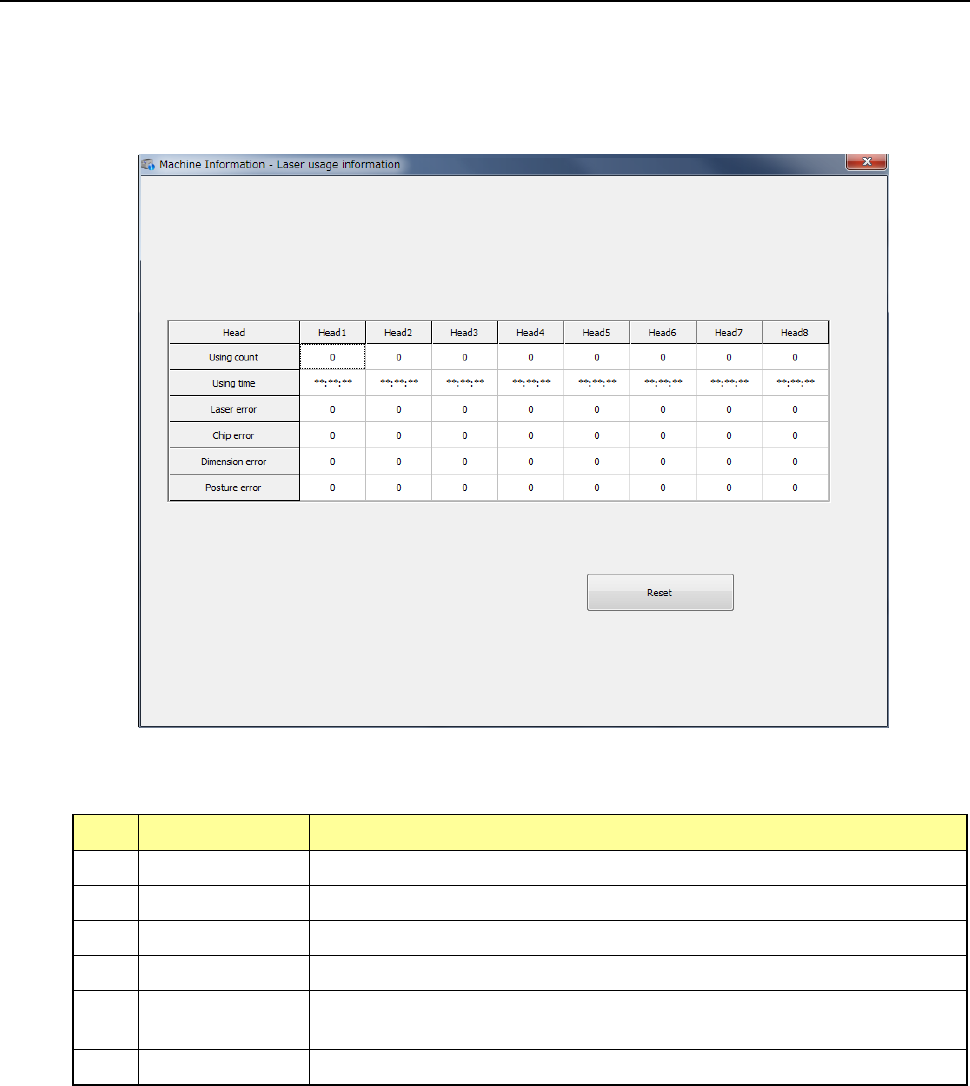 When you select [Recognition/Inspection] – [Laser usage information] in the main menu, the