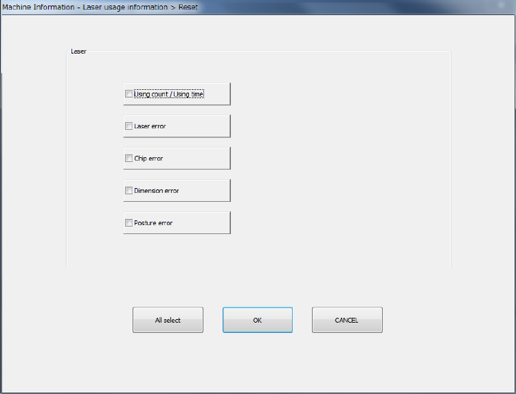 When you select [Recognition/Inspection] – [Laser usage information] in the main menu, the
