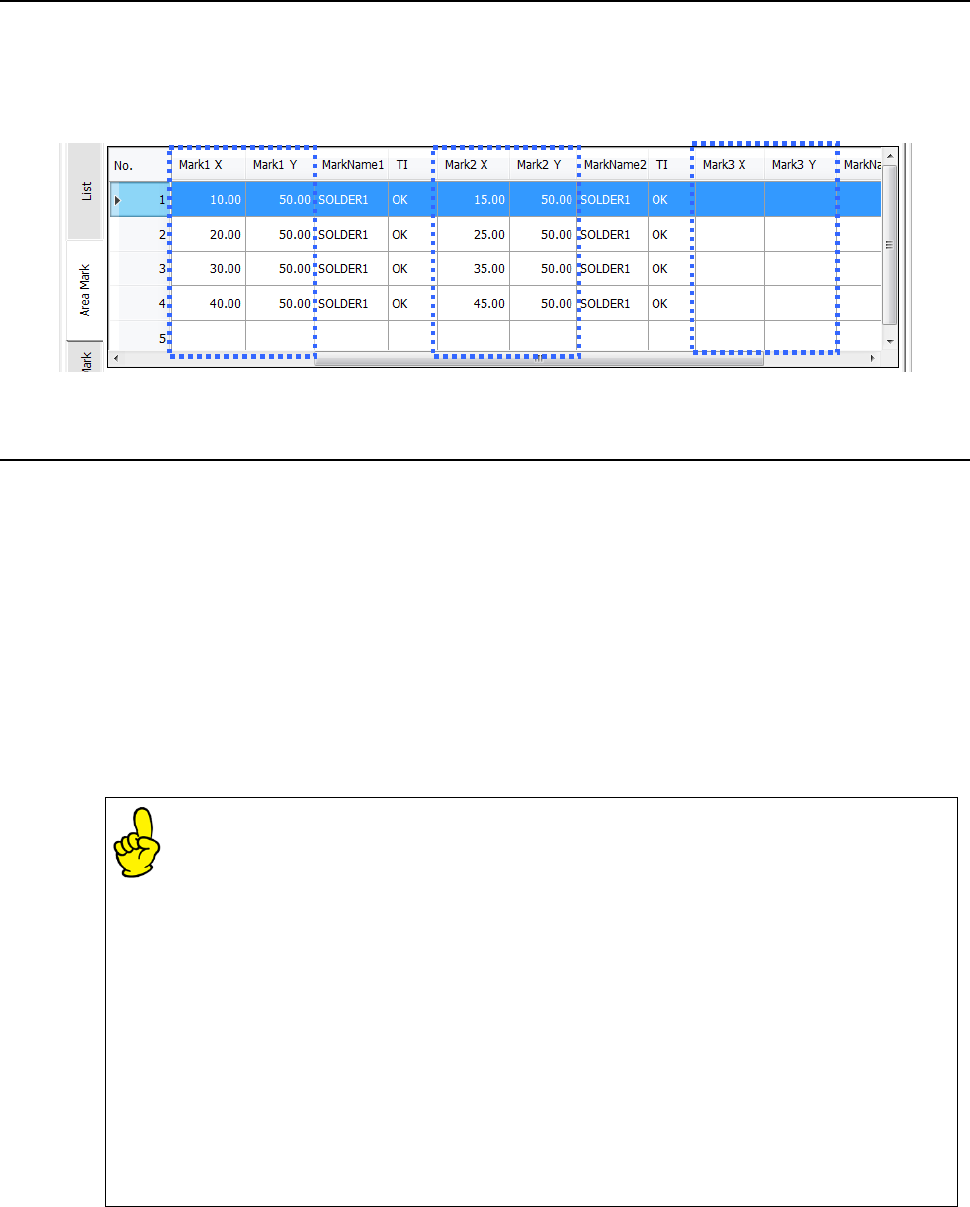 Part 2 D etaile d Descript ion of E ach Functi on Chapter 12 Handling th e Optional Device s 12 - 61 12.11.7 Program Editor 12.11.7.1 Setting a Solder Mark Align the c ursor with the “ Mark Type ” c olumn of the area fid…