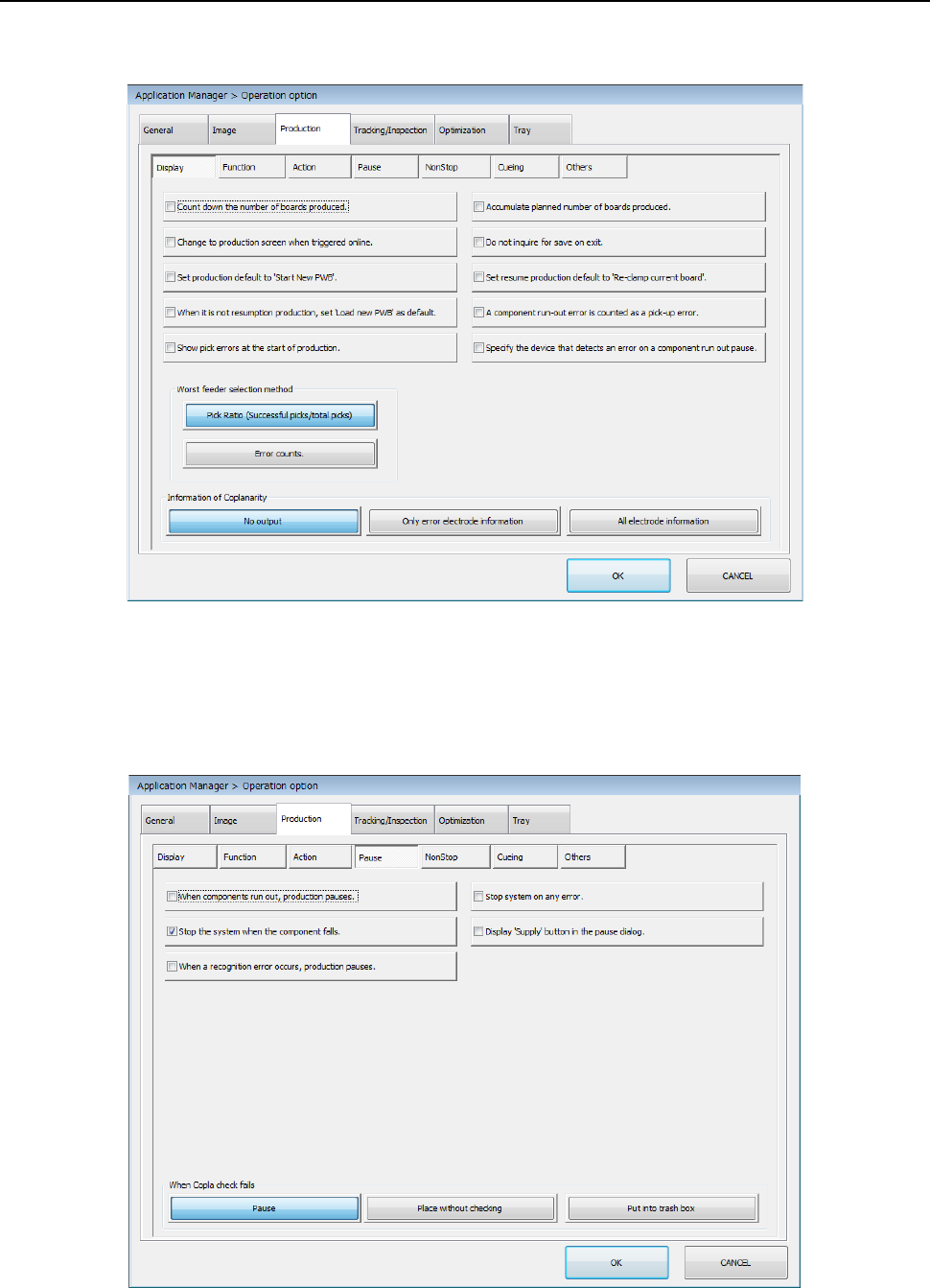 the “Operation option” screen. Next, select the “Production” tab, and then the “Pause” tab.
