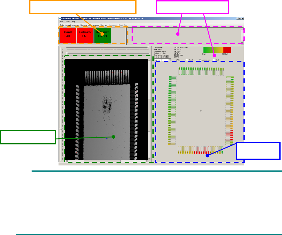 The measured coplanarity value of an electrode is displayed in three-color gradation: green,