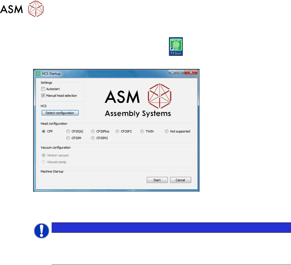 5 Working with the HCS 5.2 Head verification process 62 User Manual SIPLACE Head Care Station 10/2017 5.2.3 Starting the HCS software ► On the desktop, double-click the TB Start icon to start the verification software: ð…