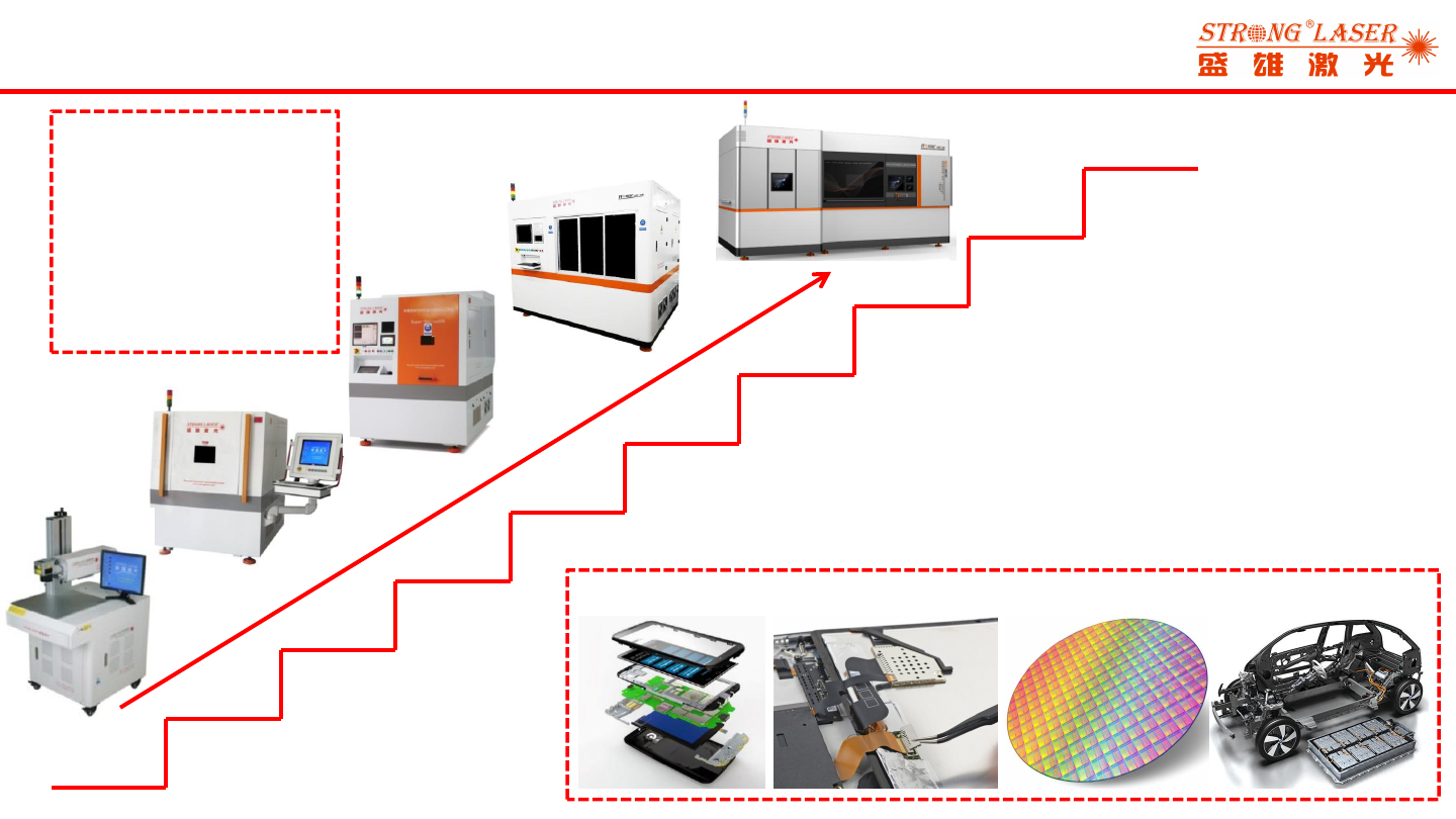 产品研发演 进&应用领域 激光打标机 薄膜电路蚀 刻机 HDI高速激光 钻孔机 2008~2011 2012 2013 2014 2015 2016 2017 2018 2019 全自动蓝宝石 激光切割机 指纹识别脆 性材料激光切割 机 双头紫外激光 切割分拣系统 18:9 TFT-LCD 全面屏激光切 割机 5G LCP & OLE D柔性屏紫外激 光切割系统 新能源动力电 池极耳切割系 统 消费电子 电路板 半导体 …