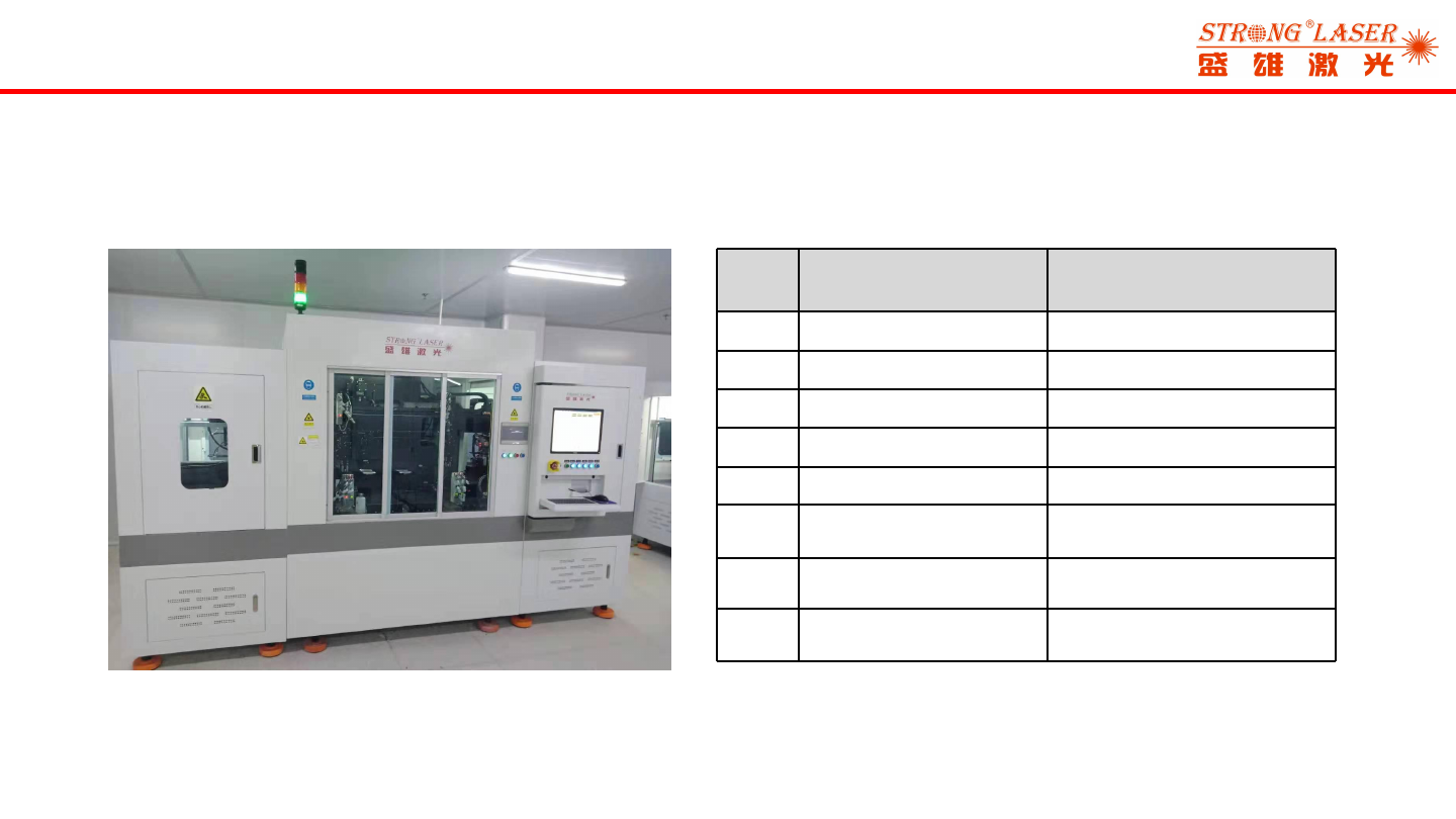 序号 项目 技术参数 1 激光器类型 1064nm ps 2 激光功率 ≥15W 3 光束质量 M²<1.3 4 聚焦光斑直径 Φ1-2μm 5 加工速度 ≤120mm/s 6 单次最大加工 厚度 ≤1mm 7 运动平台定位 精度 ≤±3μm 8 加工精度 ≤±20μm 机器参数表 手机玻璃盖 板切割系统 采用双Y轴多工位设计,两个Y轴交替切换上下料与切割,全过程无需等待,最大程度利用激光出光加工效率。 玻璃盖板切割 3.5. 玻璃盖板