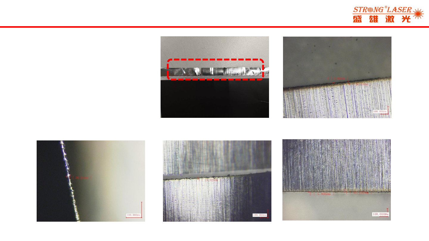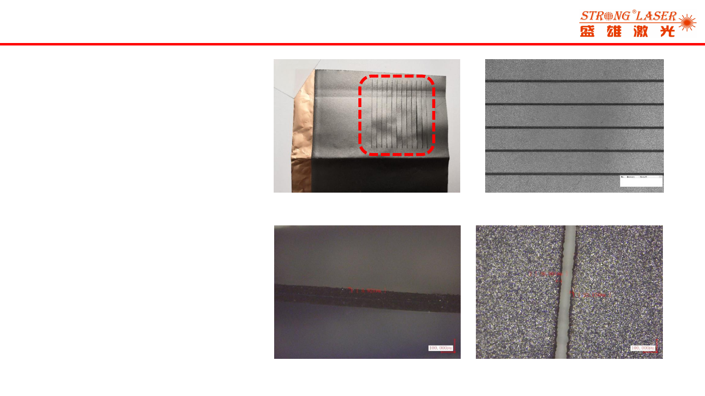 切割正面更小 的热影响(H AZ<40um) 厚度28um 铝 材 切割截面 切割效率 6000mm/s 反面切割效果 皮秒激光切割极耳效果与效率 反面切割效果 3.6. 新能源汽车