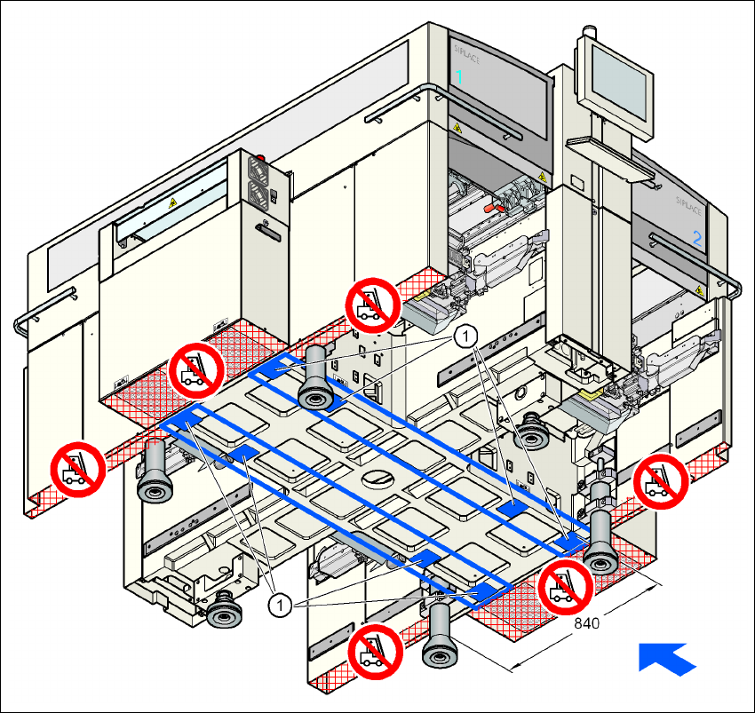 4 셋업 및 작동 사용자 매 뉴얼 SIPLACE X-Series 4.1 운송 및 납품 구성 소프 트웨어 버전 SR.605.xx 2008 년 7 월 한글판 242 4.1 .5.3 실장기를 지게차에 적재하는 지점 다음의 두 그림은 팔레트에서 장비를 들어올리거나 팔레트 없이 장비를 운반할 경우 실장기를 지 게차에 적재하는 위치 를 나타냅니다 . 참고 보다 긴 거리를 운반할 때에는 항상 팔레트와 지…