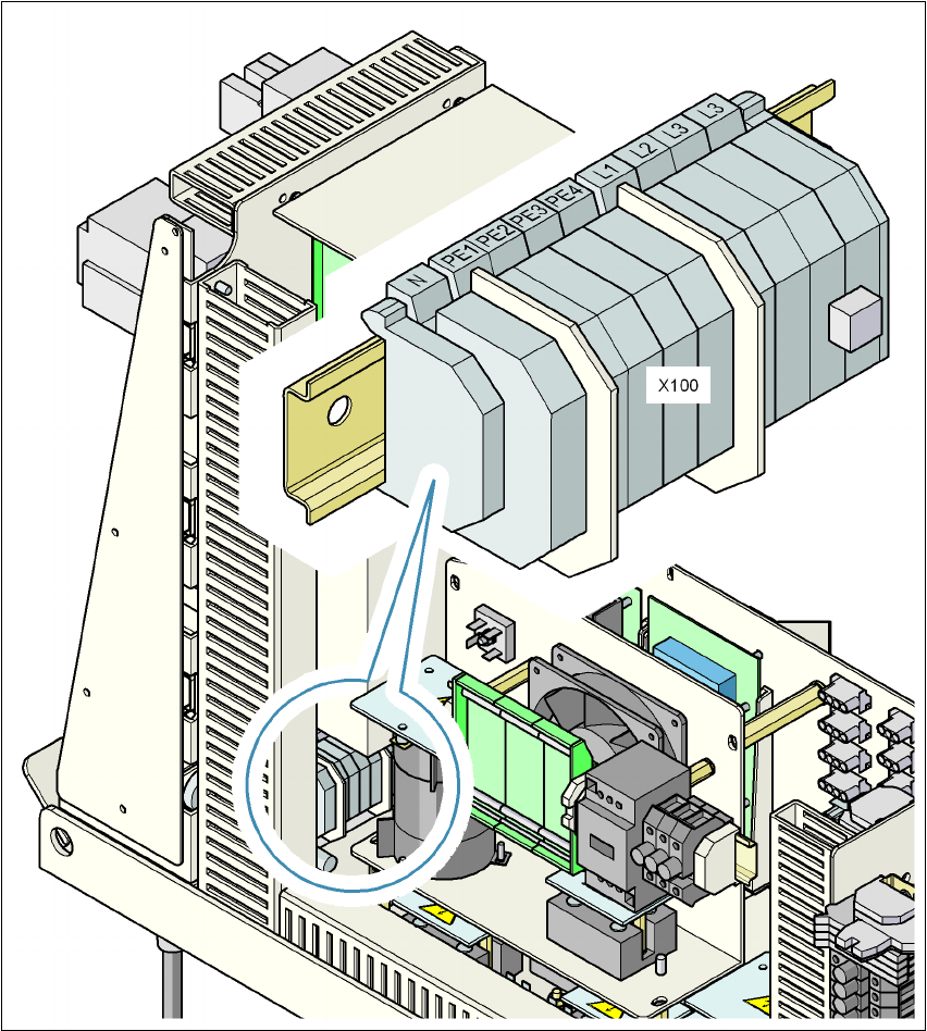 → 각진 케이블 글랜드를 통해 전원 공급 케이블을 단자 패널 X100 으로 집어넣습니다 (251 페