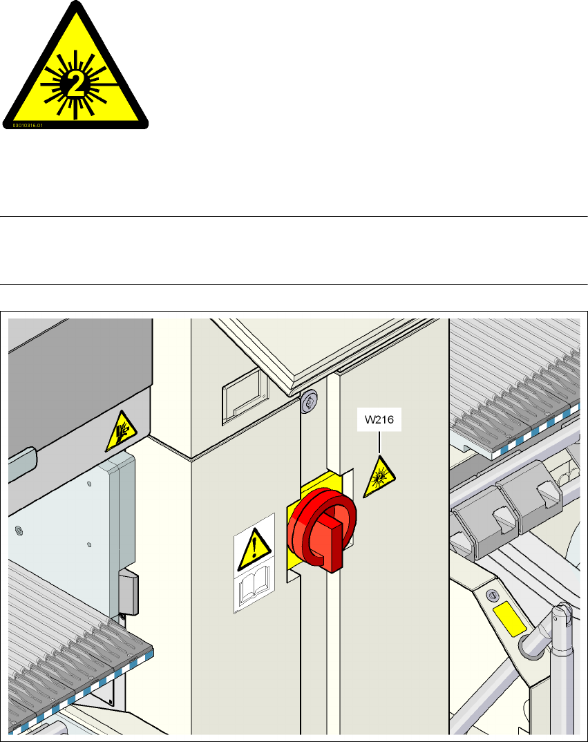 → W216 " 레이저 등급 2" 경고 사인이 있는 품목 번호 03010316-xx 장비를 식별합니다 .