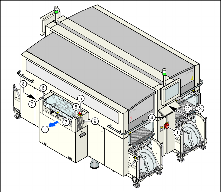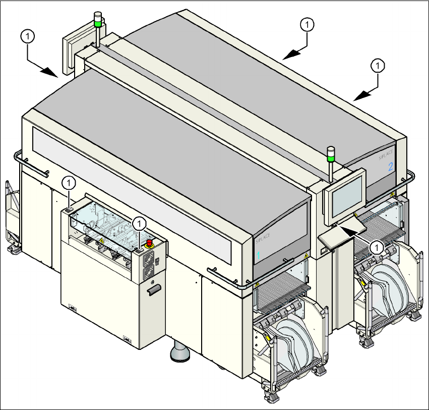 사용자 매뉴얼 SIPLACE X-S eries 2 작동상의 안전 소프트웨어 버전 SR.605.xx 2008 년 7 월 한글판 2.6 안전 장비 75 2.6 .2 실장기의 스위치 및 버튼 2.6.2.1 실장기에서 스 위치 및 버튼의 위 치 그림 2.6 - 3 스위치 및 버튼 위치 - PCB 출력 쪽 보기 (1) 메인 전원 스위치 (2) 전원 공급기 쪽에 있 는 오퍼레이터 패널의 정지 버 튼 (…