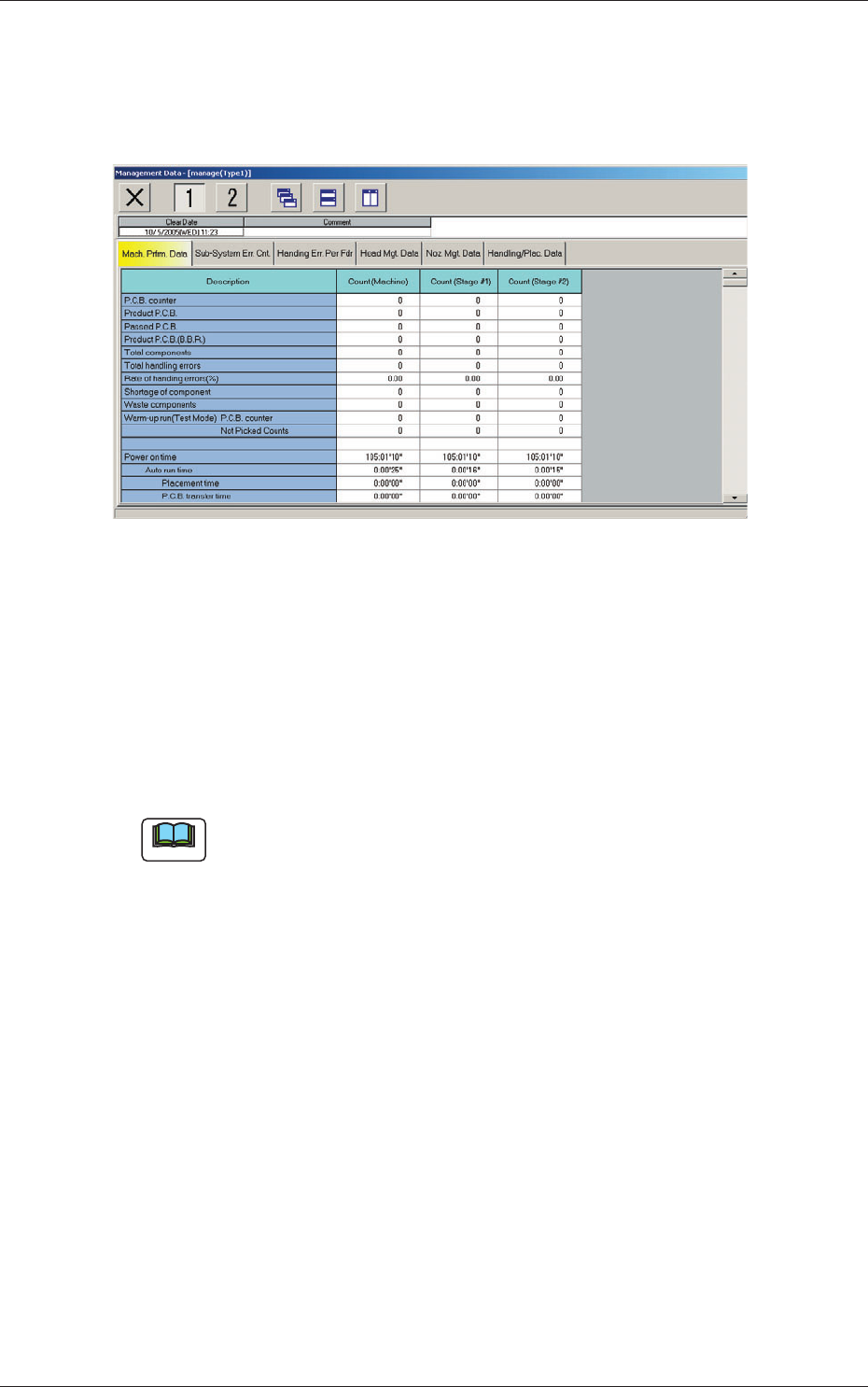 5-9 AIVEDT -ID 2.1 Machine Performance Data 0606-009 2.1 Machine Performance Data When the "Mach. Prfrm. Data" tab is pressed in the "Management Data" window , the following tab sheet appears inside t…