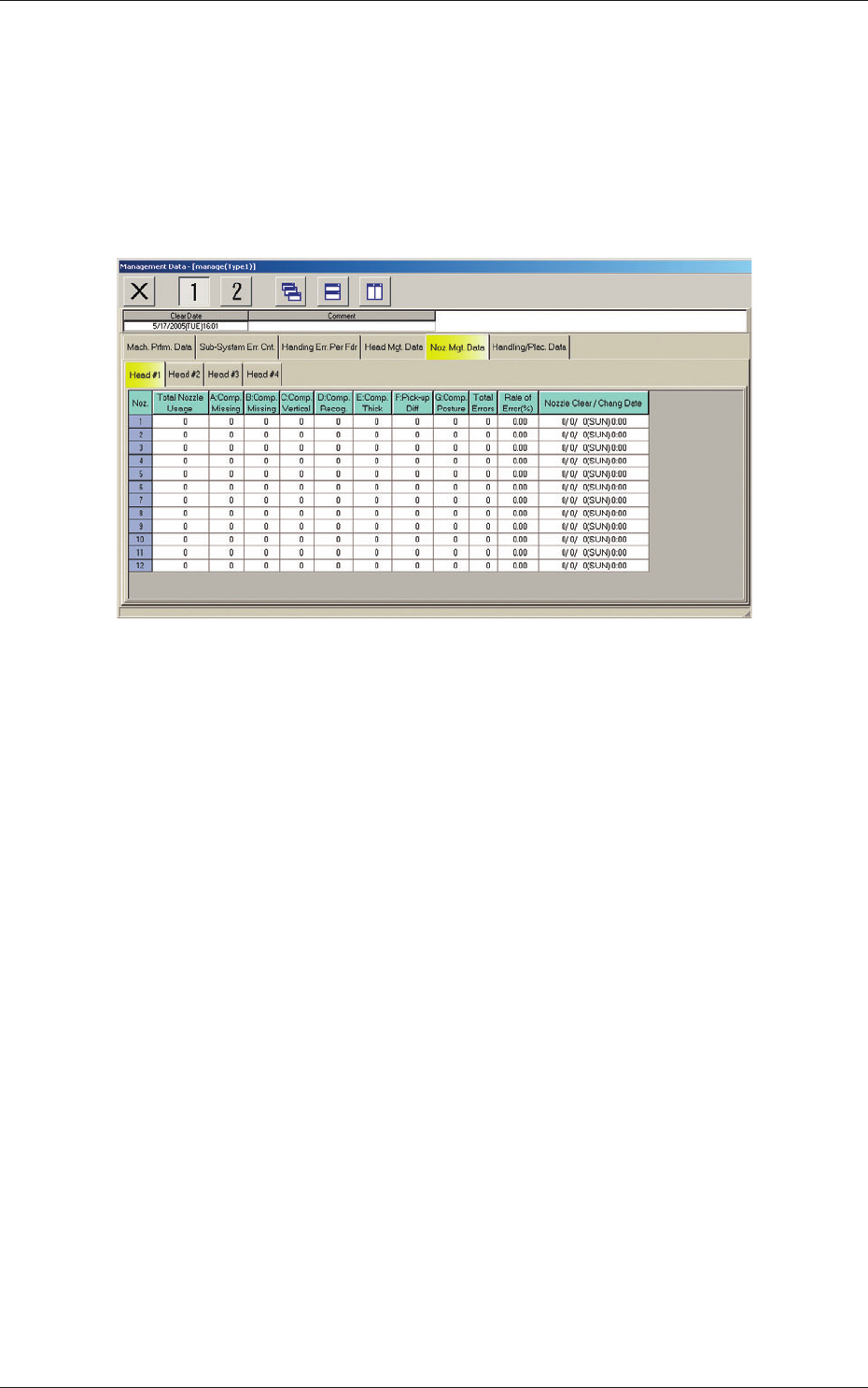 5-19 AIVEDT -ID 0606-009 2.5 Nozzle Management Data 2.5 Nozzle Management Data The corresponding tab sheet enables the operator to view the nozzle management data. When the "Noz. Mgt. Data" tab is pressed in th…