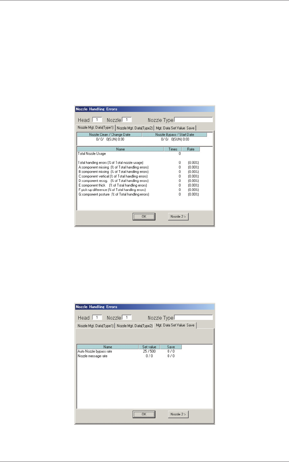 5-39 AIVEDT -ID (8) [Nozzle 1] through [Nozzle 12] Buttons When a button is pressed, the corresponding "Nozzle Handling Errors" window opens for the selected nozzle. • "Nozzle Mgt. Data (T ype 1)" and…