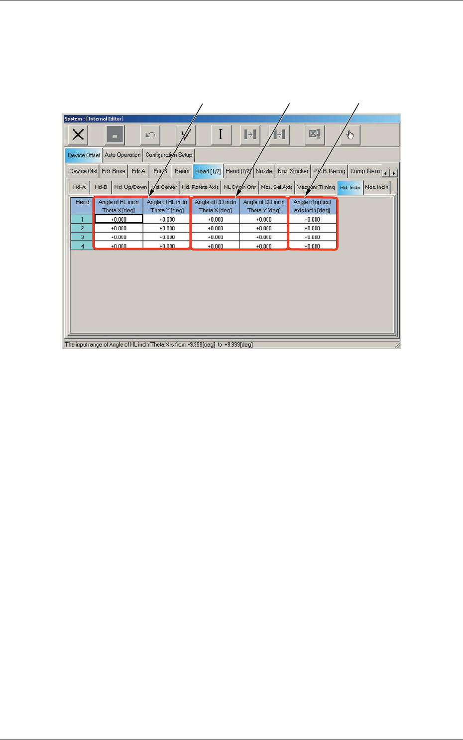 6-32 AIVEDT -ID 2.1.13 Head Inclination Offset When the "Head [1/2]" tab is pressed in the "Device Offset" tab sheet and the "Hd. Incln" tab is selected, the following tab sheet appears. [1]…
