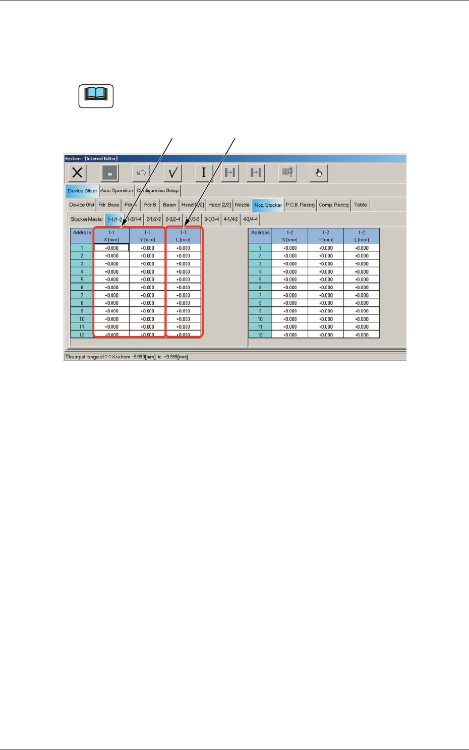 When the "Noz. Stocker" tab is pressed in the "Device Offset" tab sheet and