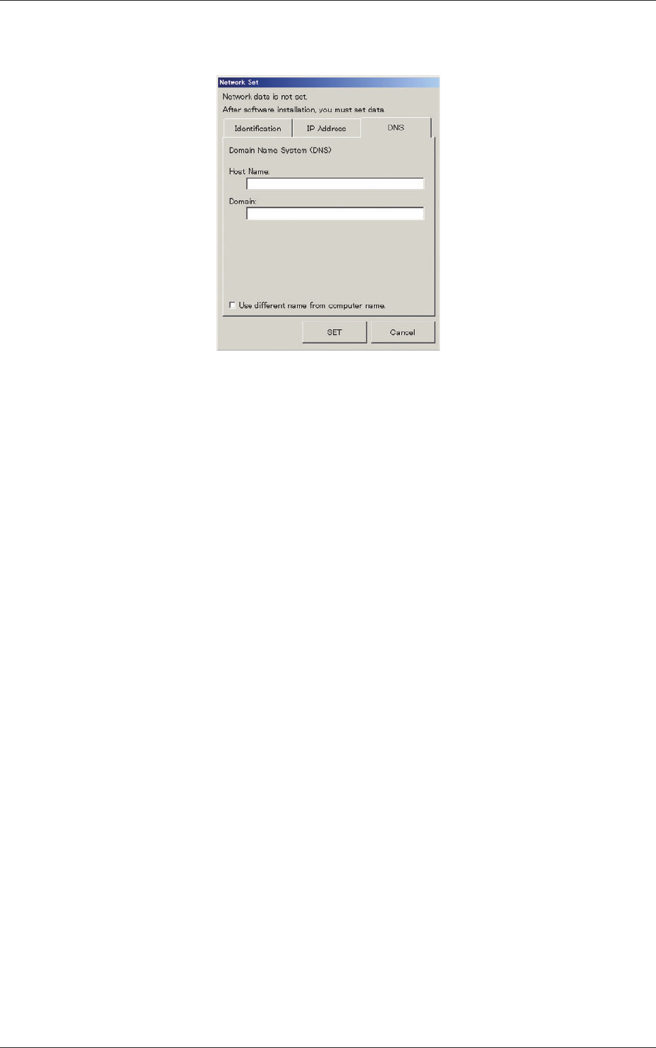 6-95 AIVEDT -ID (3) In the "DNS" tab sheet, specify the domain name system (host and domain names). Fig. 3F86 "Network Set" Window ("DNS" T ab Sheet) (4) When the [SET] button is pressed, th…