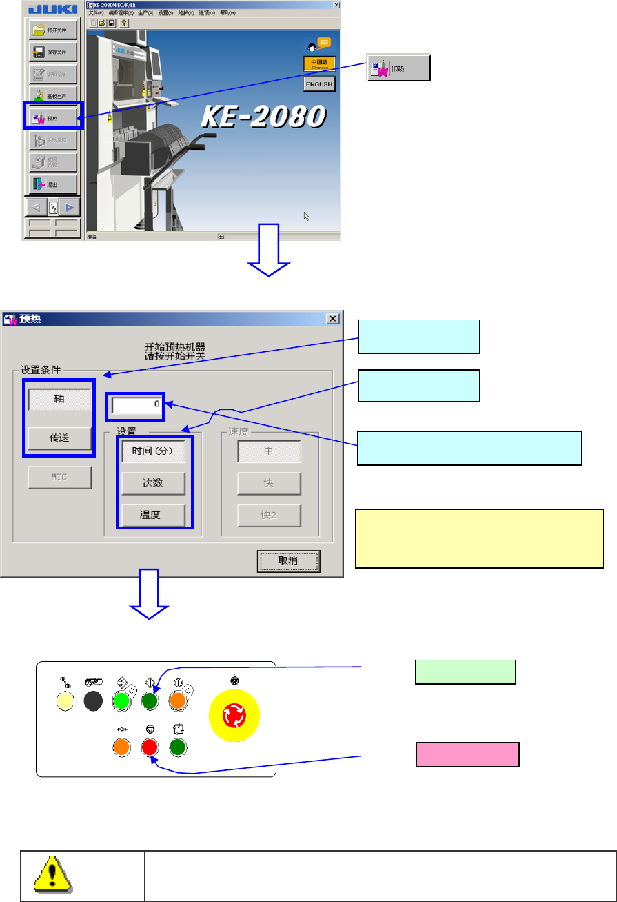 操作手册Ⅰ 2-3 步骤 2 执 行 预 热 ①生产前执行预热,以确保在稳定状态下开始生产。 在主画面上选择: ② 显示预热画面。请设置条件。 ③ 请确认安全盖已盖好后,再按下操作面板上的 [ 开始 ] 开关。 请按下 , ・ 轴 传送起动,开始预热。 要结束预热时, 请按下 {时间 (次数) 设置后, 完成预定时间 (次 数)后即结束。} ※ 有关预热画面的详细内容, 请参见 『使用 说明书 CD 』 的 「 2-4 预热 」 。 开…