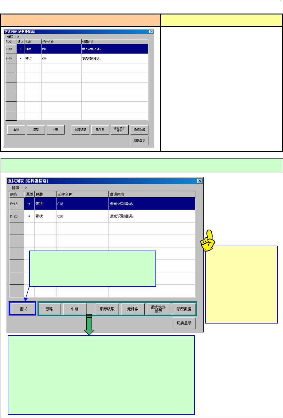 操作手册Ⅰ 3-2 3-2 用完元件(操作选项中未选中“无元件暂停”时) 可贴装的所有元件贴装完毕后显示下列画面,装置进入暂停状态。 错误画面 错误要因、原因 ①用完元件。 ②元件吸取错误 (因带子剥离缠住、 传送不良等造成 的吸取位置偏离等)。 处理错误的方法 ☆ 忽略 :跳过用完的元件,进行下一个基板的生产。 ☆ 中断 :中断生产。 ☆ 跟踪吸取 :用摄像机,进行吸取位置的校正处理。 ☆ 元件数 :可设置元件数量。 ☆ 激光波形显示…